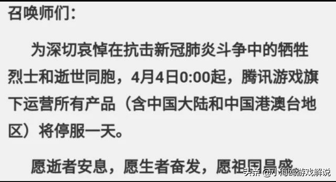 而游戏停服,也是一种最基本的尊重,停止一天的娱乐项目。作为个人,也是应该停止手里的娱乐项目。正因为有他们,而保护了我们的安全。而在疫情中逝世的同胞,悼念。作为企业,有企业的责任和担当。停服游戏,也是在这场疫情面前,对我们的英雄和逝世同胞,做出了属于自己的那一种崇敬,哀悼之情。