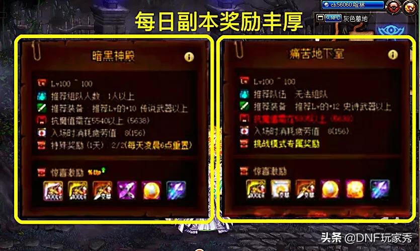 在DNF全新的100级版本之中,个人认为痛苦地下室和暗黑神殿两张地图无论从哪个方面来看都是非常完美的每日必刷副本。