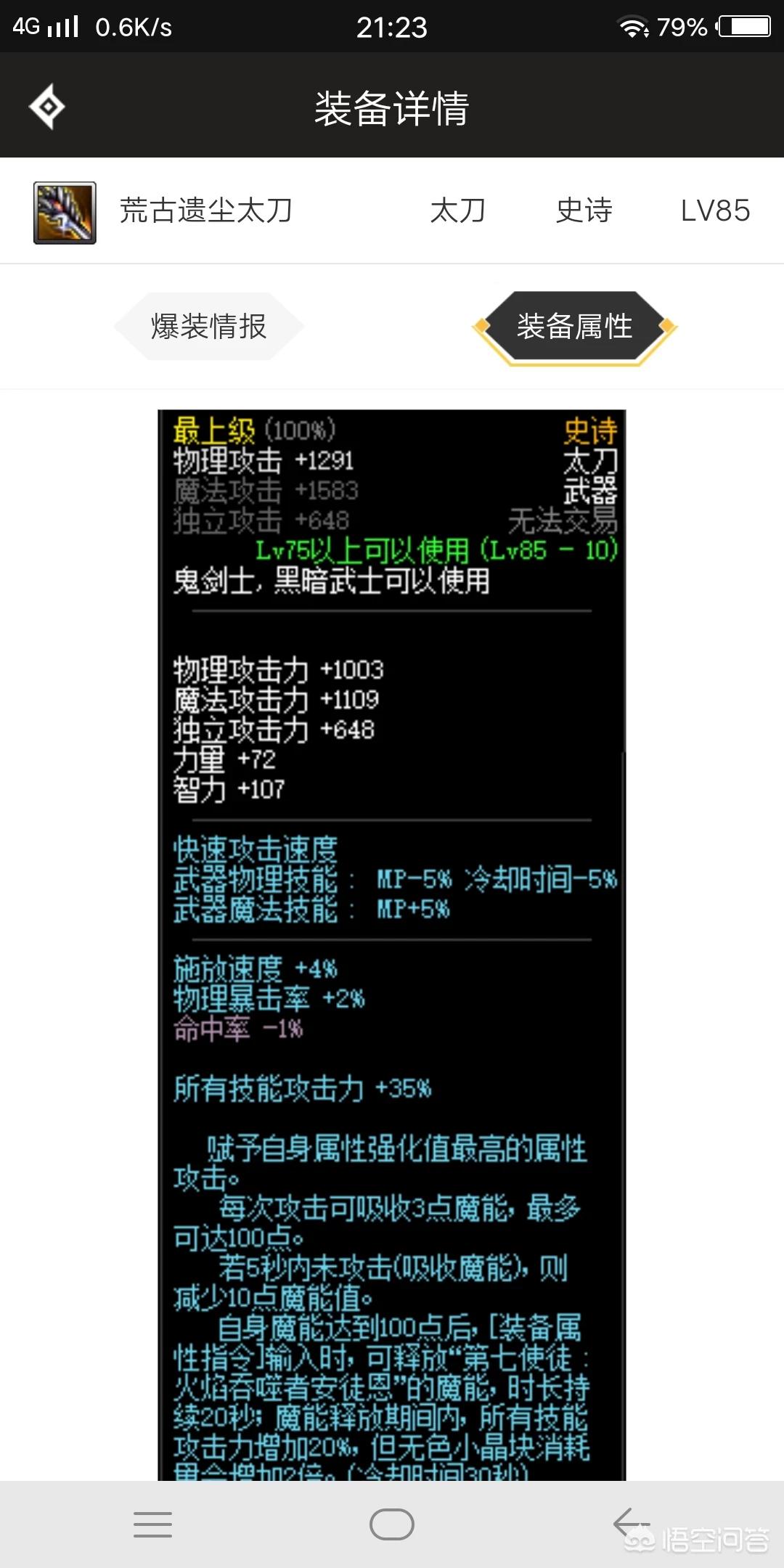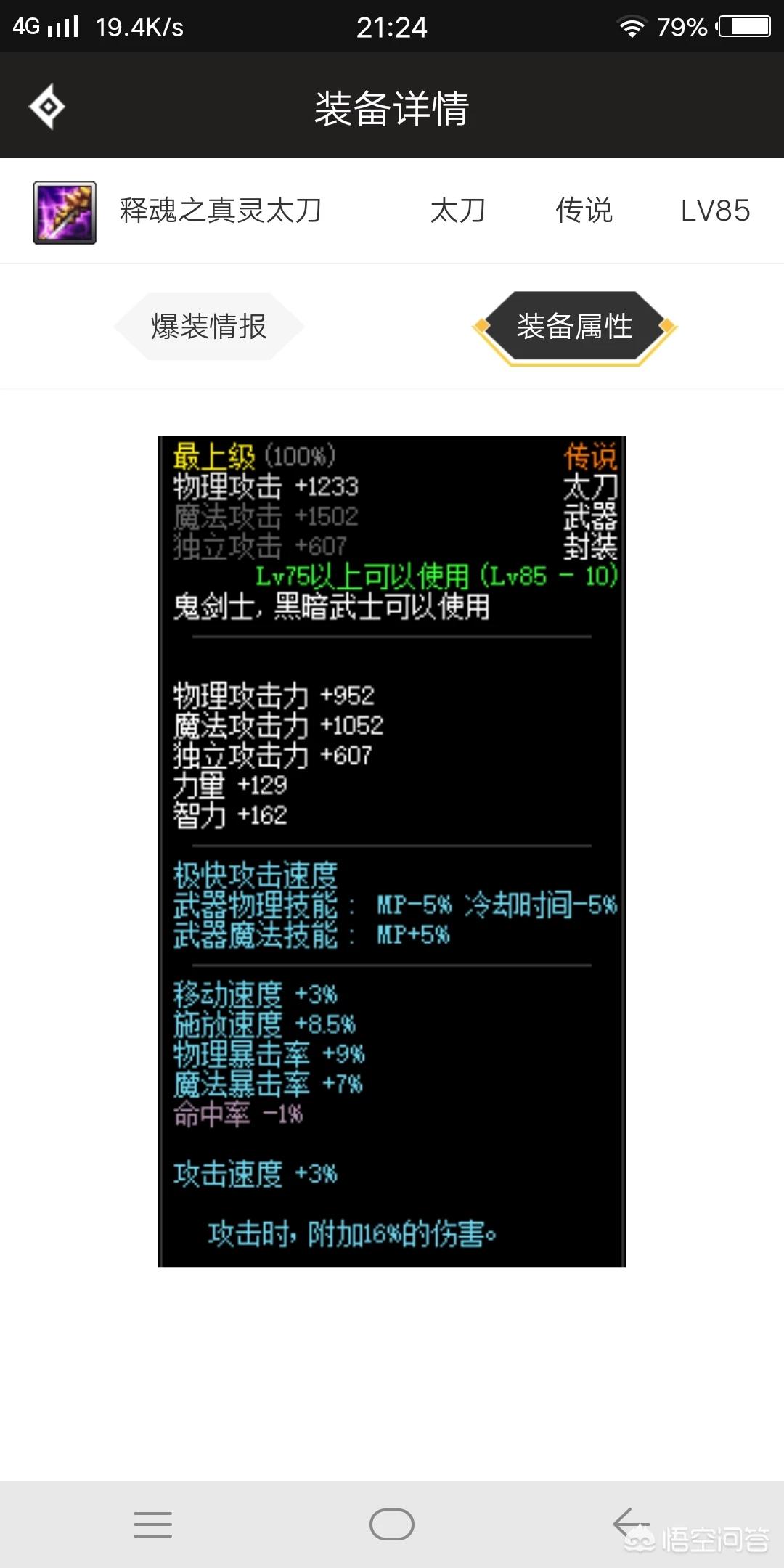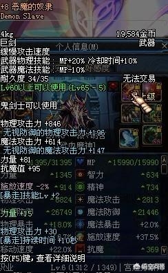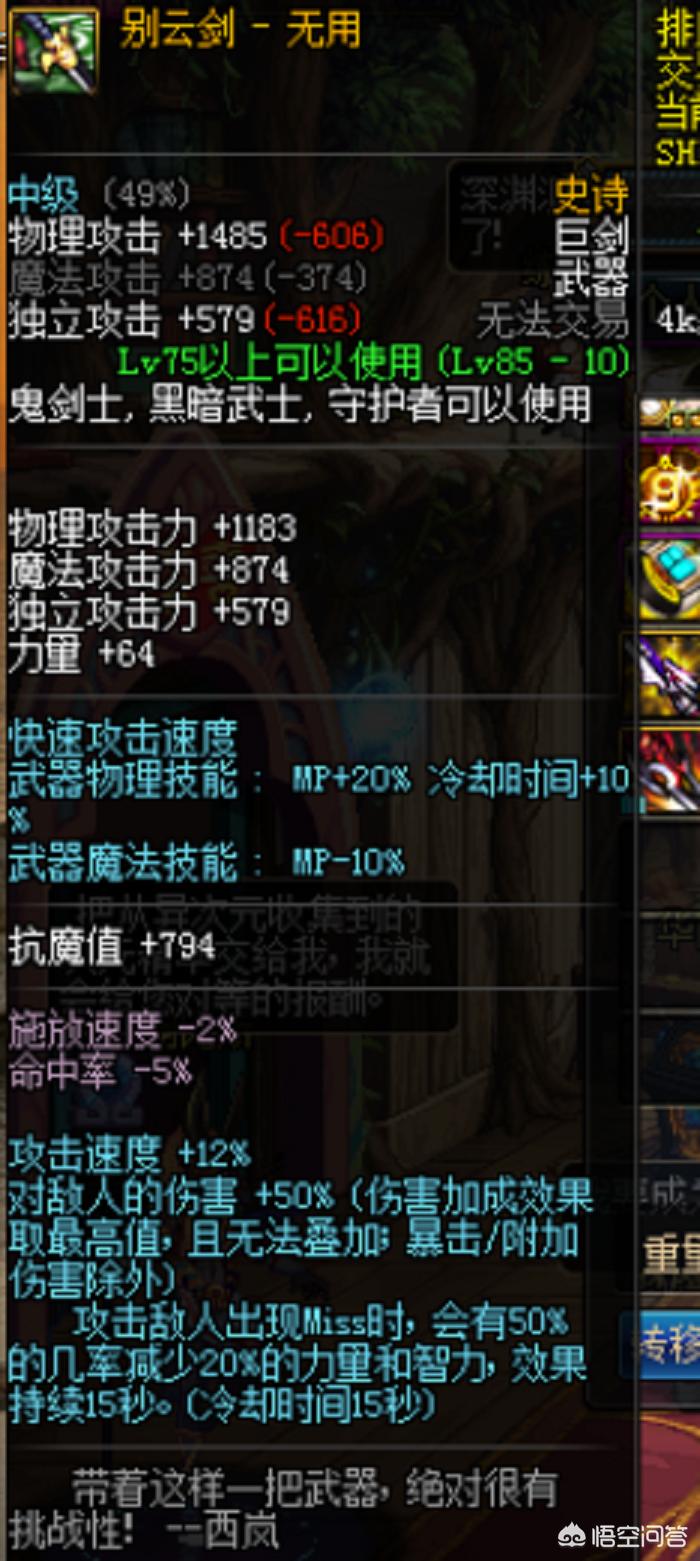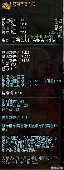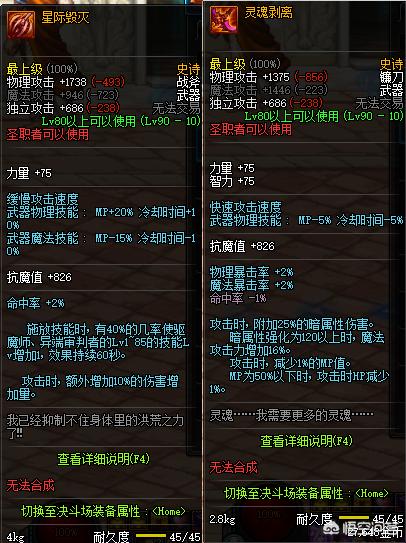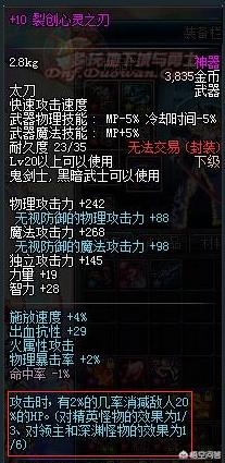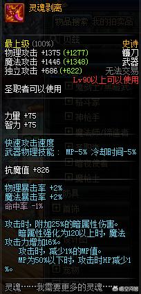 好了,以上扯淡的话你肯定看得出来,说正经的。这把武器附加了25%的暗属性伤害,而且暗属性强化到120以上魔法攻击+16%。现在的版本属强堆到120就跟喝水一样容易,单看这把武器的属性,可以说完爆荒古。但也有个比较烦的缺点,带上这把武器会十分的缺蓝,刷图时需要时不时的嗑蓝药,不然,掉的就是血了,现在才明白这把武器如果剥离不到别人的灵魂,就会剥离主人的灵魂。