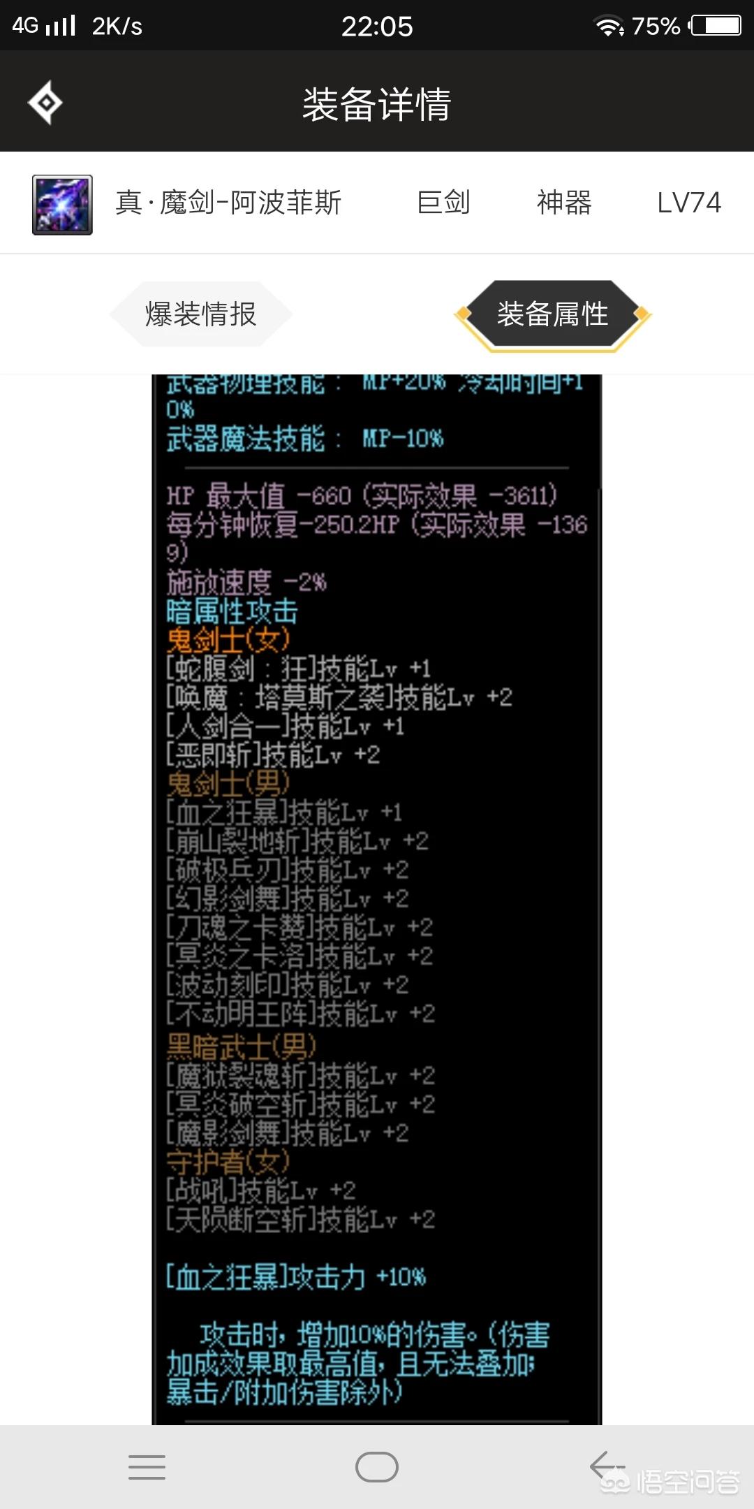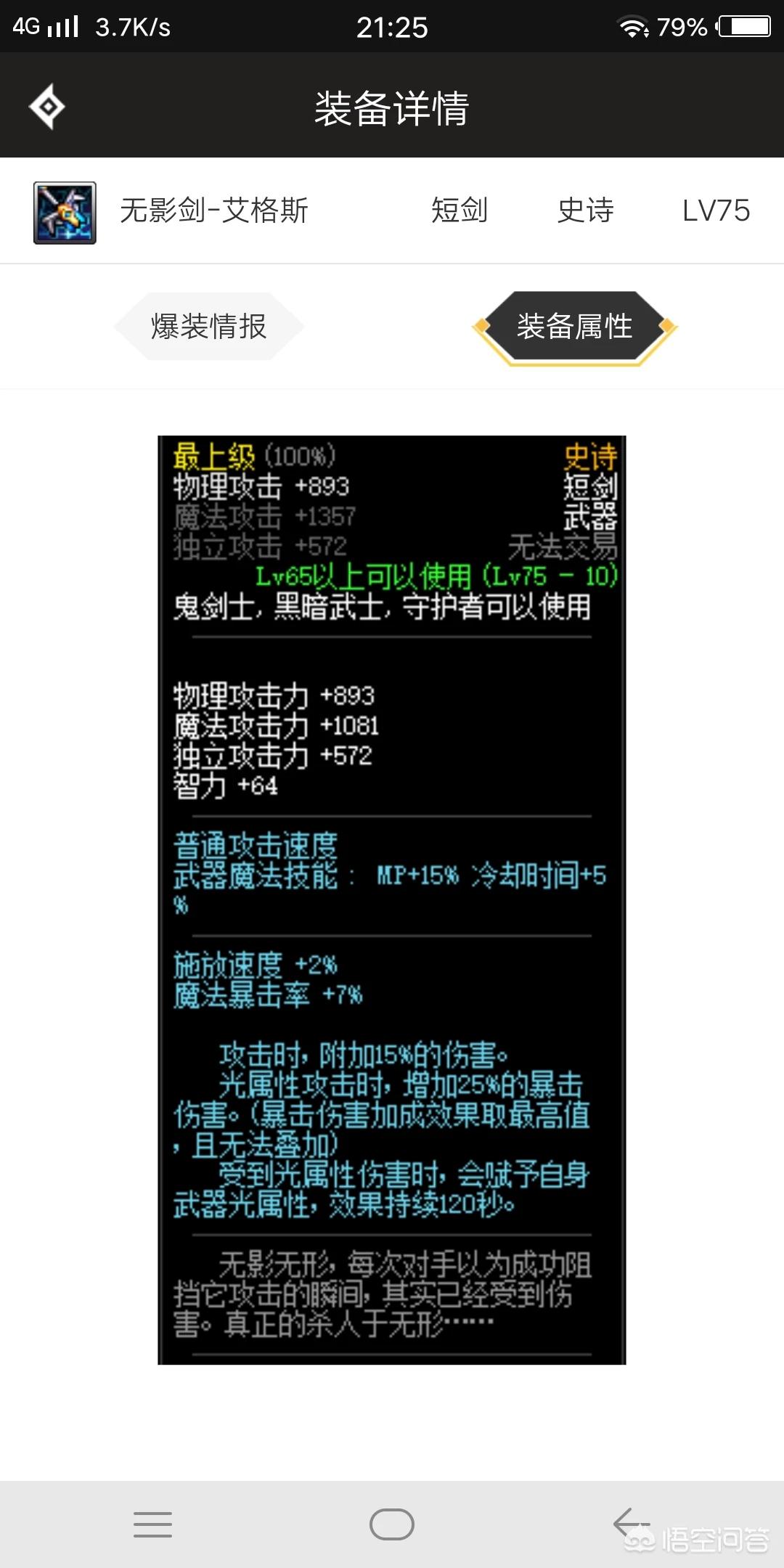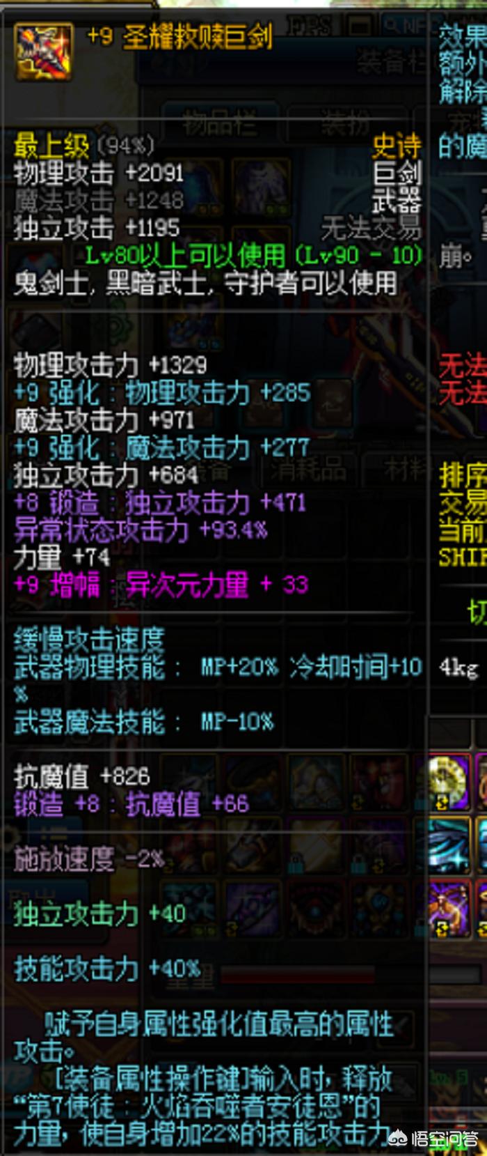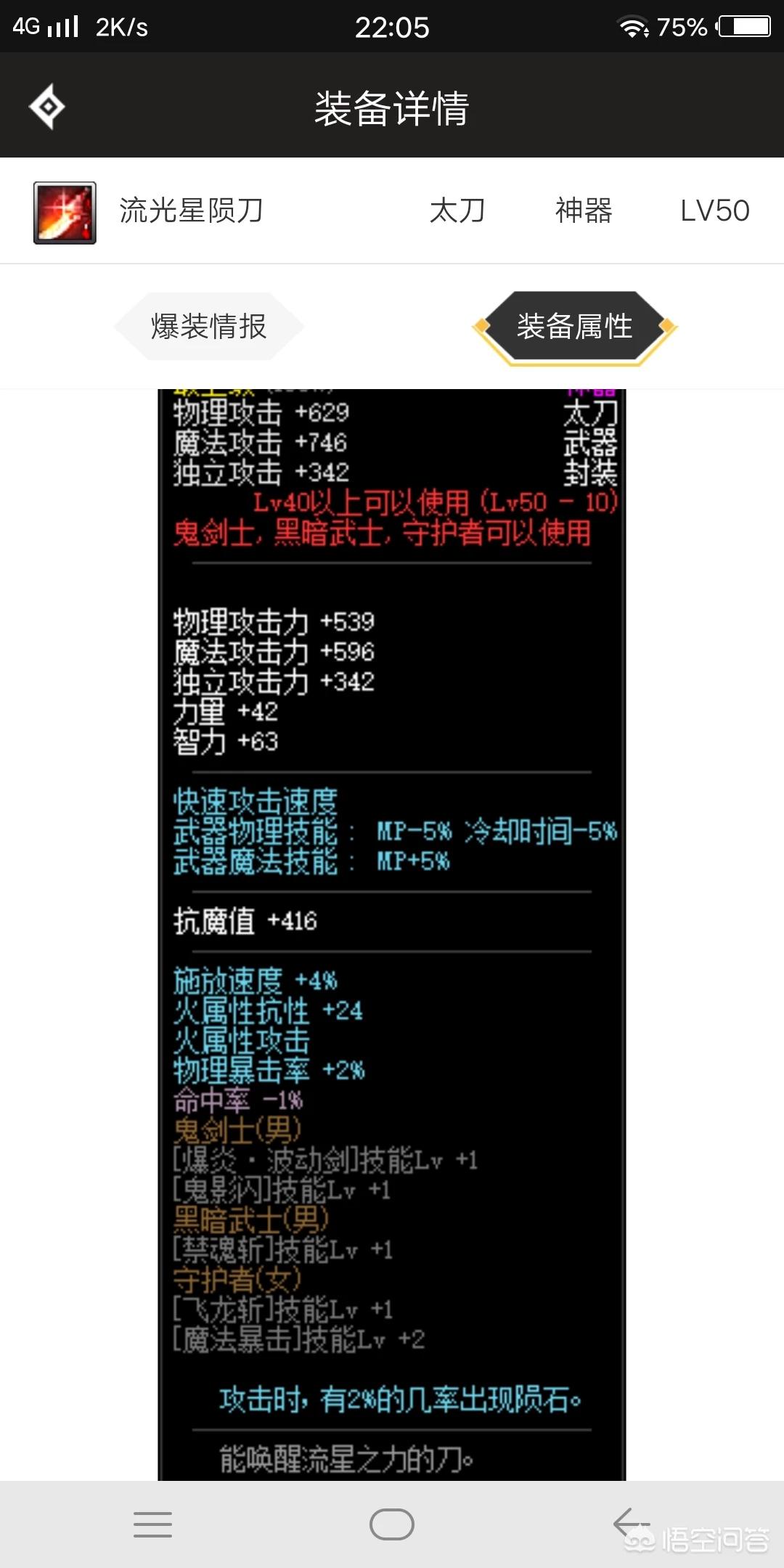 好了,以上扯淡的话你肯定看得出来,说正经的。这把武器附加了25%的暗属性伤害,而且暗属性强化到120以上魔法攻击+16%。现在的版本属强堆到120就跟喝水一样容易,单看这把武器的属性,可以说完爆荒古。但也有个比较烦的缺点,带上这把武器会十分的缺蓝,刷图时需要时不时的嗑蓝药,不然,掉的就是血了,现在才明白这把武器如果剥离不到别人的灵魂,就会剥离主人的灵魂。