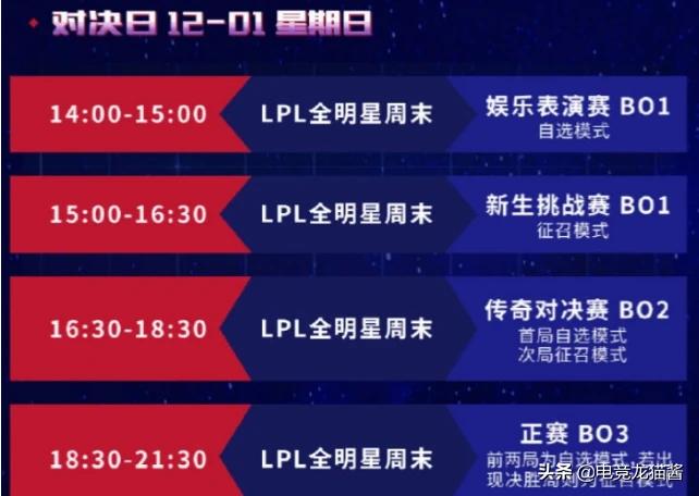 期间,新生挑战赛、传奇对抗赛及全明星正赛三项重磅赛事都将打响,本赛季的年终颁奖盛典与首批名人堂入选成员的荣誉授予仪式也将举行。2020年12月9日,LPL全明星周末宣布将延期举办。2021年1月1日,2020LPL全明星周末开启。