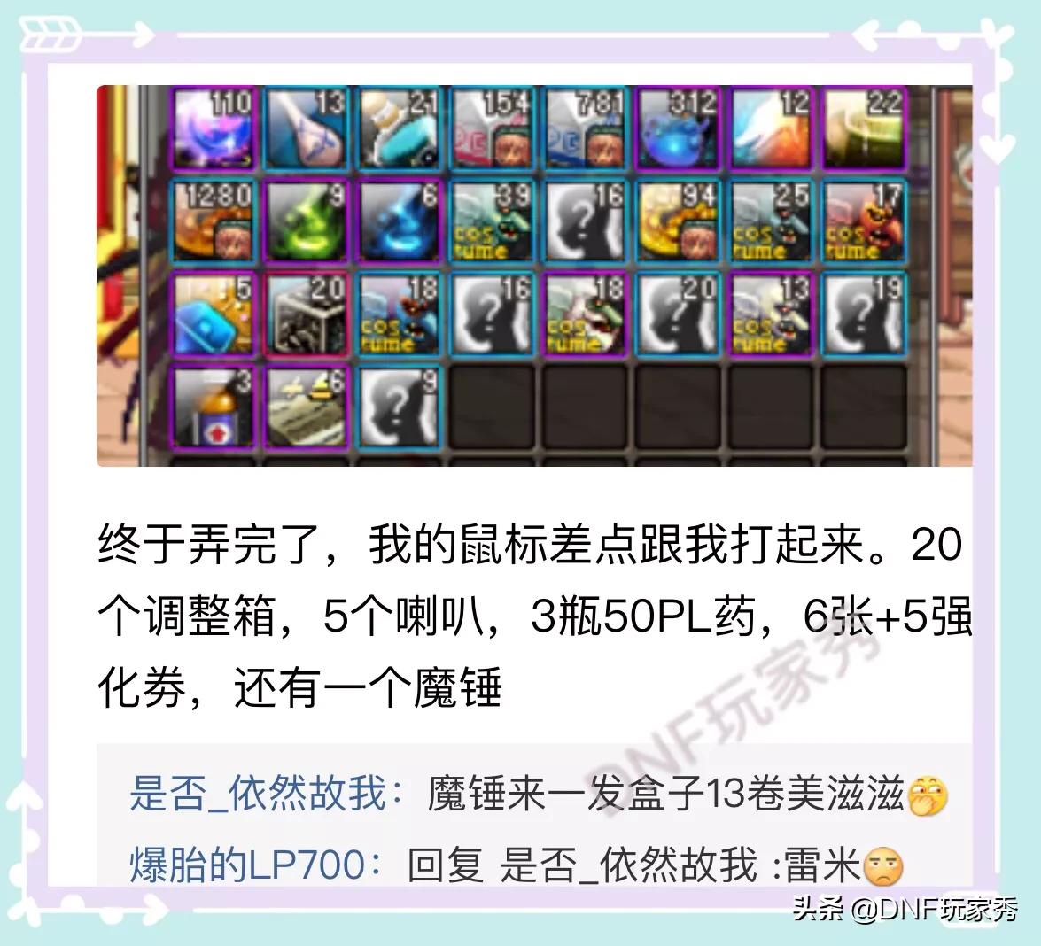 两个多小时过去了,这位勇士的小手都按软了,终于是抽完了,最后获得了“20个品级箱,5个频道喇叭,3个50疲劳药,6张+5强化券,一个魔锤,然后魔锤开了雷米。
