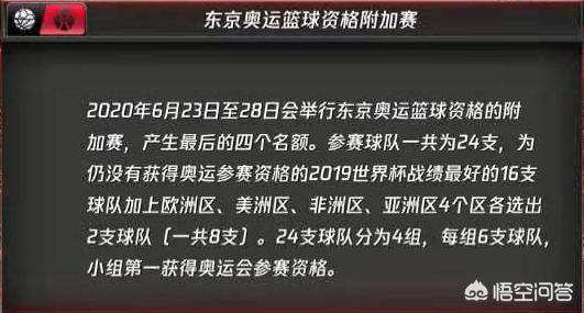 接下来中国男篮唯一获得东京奥运会资格的途径就是“附加赛”:于2020年6月23日~28日举行,一共24支球队参加(2019年没有获得东京奥运会资格的战绩最好的16支球队,再加上欧洲区、美洲区、非洲区、亚洲区各2支球队),分成4个小组,每个小组6支球队,获得小组第一的球队即可获得东京奥运会参赛资格!