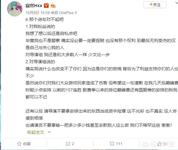 今天花儿在逛微博的时候看到触手主播寂然接连发了两条与王者荣耀导演组相关的微博,微博的大致意思是寂然已经放弃针对导演组,并向导演组道歉,希望他们能够高抬贵手,希望在他以后的巅峰赛和排位中不会再被安排!也希望以后演员不要再把演别人当成自己的资本,你赚钱可以但是拿去炫耀就过分了!