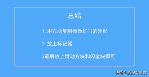第四步,在标记器的旁边放上滑动方块,将他们连接起来,按上开关。打开开关我们就可以看到这个门就自动地划开了。