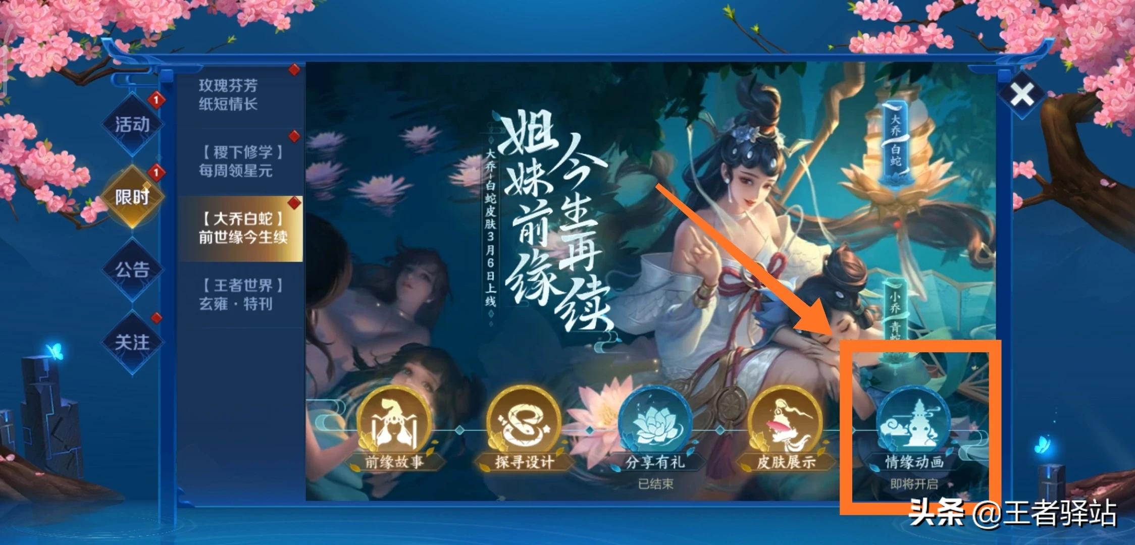 首先小乔“青蛇”皮肤品质依旧是史诗级,和大乔“白蛇”一样所以首周的价格是710点券。因为不是限定皮肤所以大家也不用担心买不着,如果人气不高的话官方也会将其加入碎片商店参与兑换,不过时间肯定需要好久。预计下周会正式登录上线,因大乔白蛇前世缘今生续的提示,前面四个都已经开放查看了,只有最后一个情缘动画还没有出来。