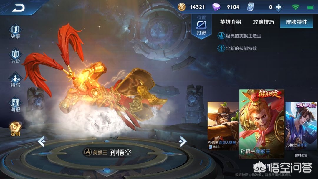 孙悟空的“美猴王”是猴年限定皮肤,这款皮肤从美工和建模来说绝对满分,身披金甲圣衣手拿如意金箍棒的孙悟空完全符合大家心目中“齐天大圣”的形象,但是这手感可就差的多了,个人感觉跟原皮肤没什么区别,甚至都不如“荒野大镖客”手感好,所以很多玩家即使是买了这款皮肤也很少用,一般都会用至尊宝、大圣娶亲一类的。