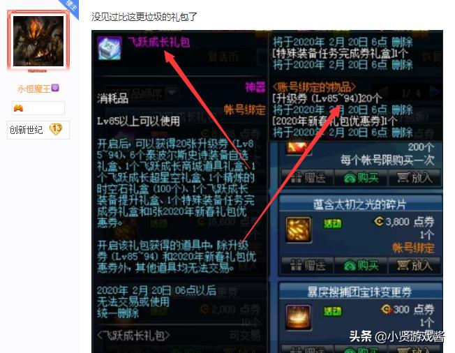 这主要就跟礼包的名字和所赠送的升级卷有关,飞升就是极快升级,如果给一个黄金经验胶囊自己升到95级那就叫做飞升,但是这个礼包只赠送了20张升级卷,还是85~94级的,所以根本配不上飞升这两个字。