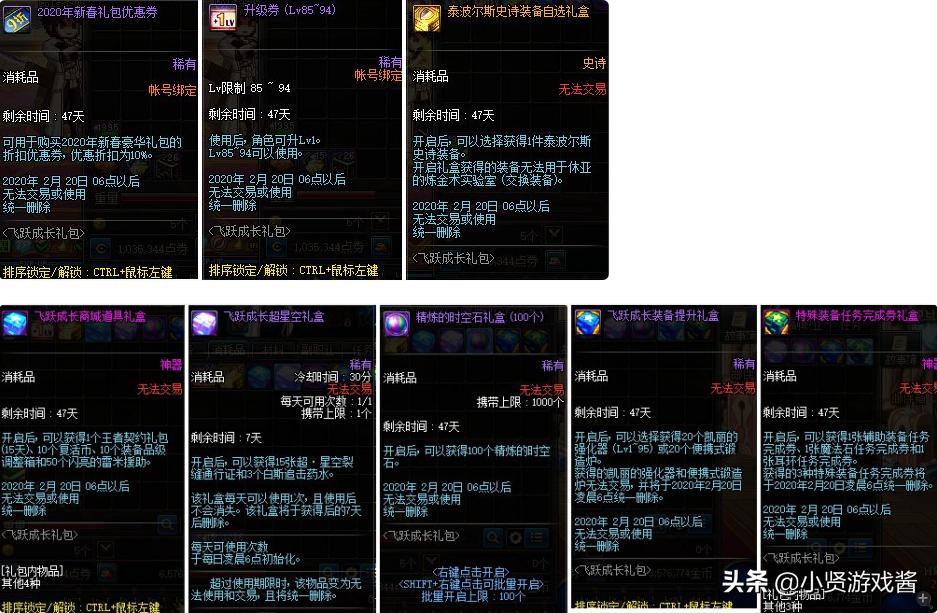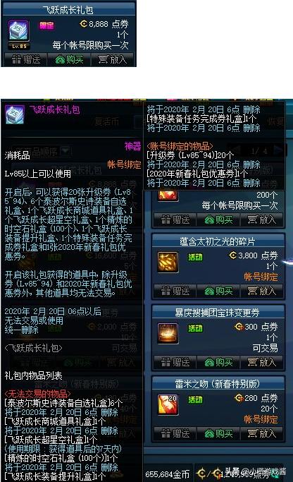 飞跃成长礼包售价8888点券,每个账号限购一次一次,礼包包含20张升级卷(85~94),6个泰波尔斯装备自选礼盒(永久),飞跃成长超星空礼盒,精炼时空石礼盒(100个),飞跃成长装备提升礼盒,以及没用的特色装备任务完全券礼盒和一张春节礼包优惠卷,道具还是蛮多的。