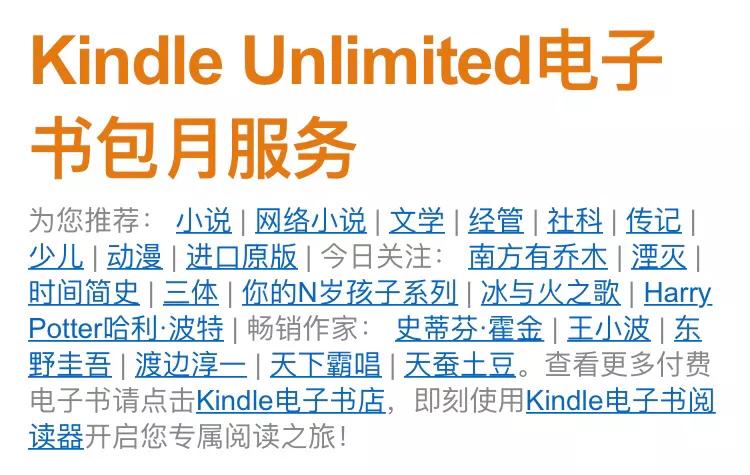 2、在越来越重视版权的时代,kindle的unlimited功能会拥有越来越多的用户,Kindle的电子书更新速度也最有保障!