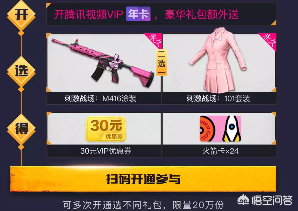 1、购买腾讯VIP年卡(233元)可获得M416皮肤或101粉色套装。