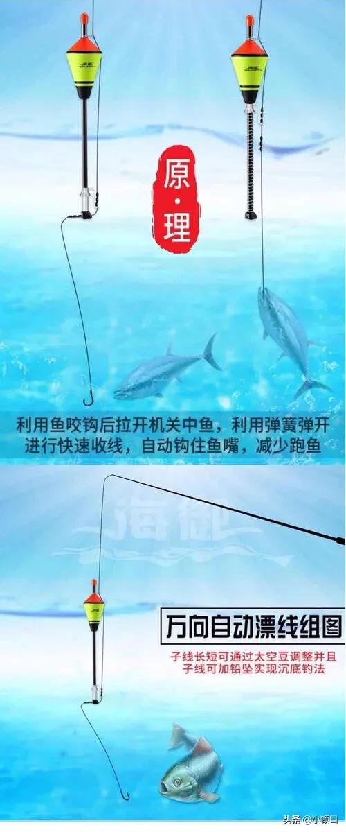其原理:鱼咬钩后拉开机关中鱼,利用弹簧弹开,进行快速收线,自动钩住鱼嘴,减少跑鱼