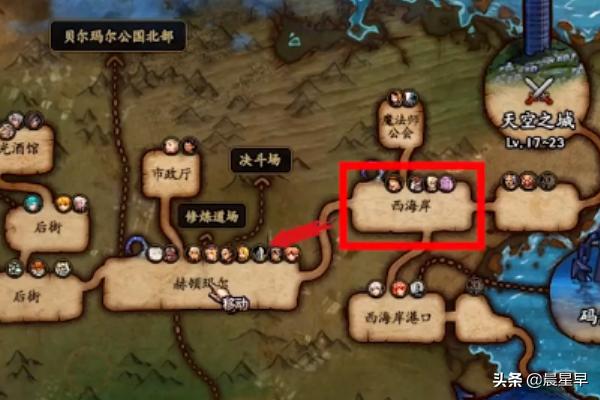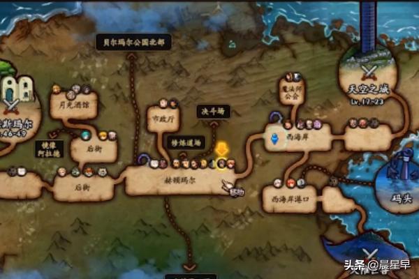 打开DNF的大地图,根据地图从西海岸直直向里就可以到达赫顿玛尔废墟了。