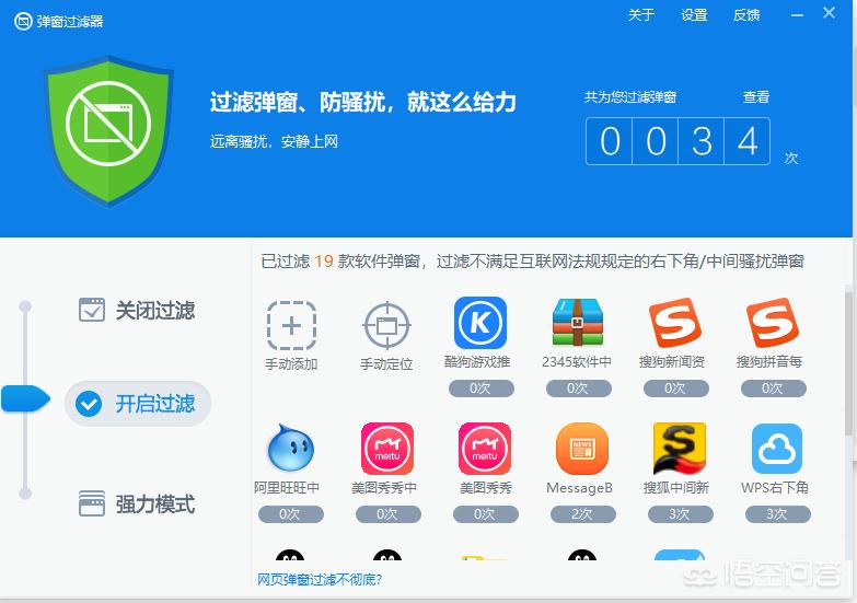 1.最受欢迎的是“弹窗过滤”,相信很多人都有过这种烦恼,一开机电脑就弹出各种软件营销弹窗广告,甚至有时候在编辑文档的时候,突然弹出个广告窗口,此时心情用一个字就能表达“烦”。用了这个弹窗过滤就能过滤掉很多弹窗广告,用起电脑来也顺心多了。