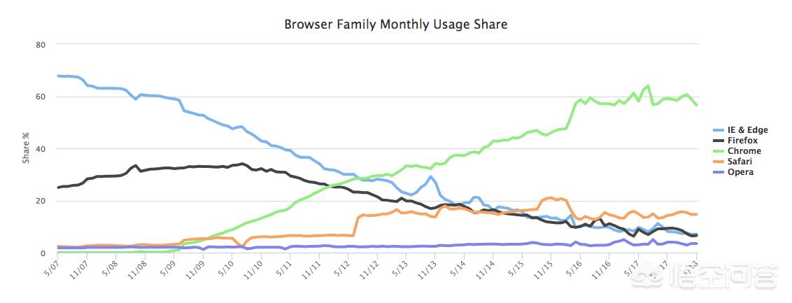 先看看各种浏览器市场占有率从07年到18年的变化,Chrome 的地位基本跟儒家在中国的地位一样,一枝独秀,无与伦比。