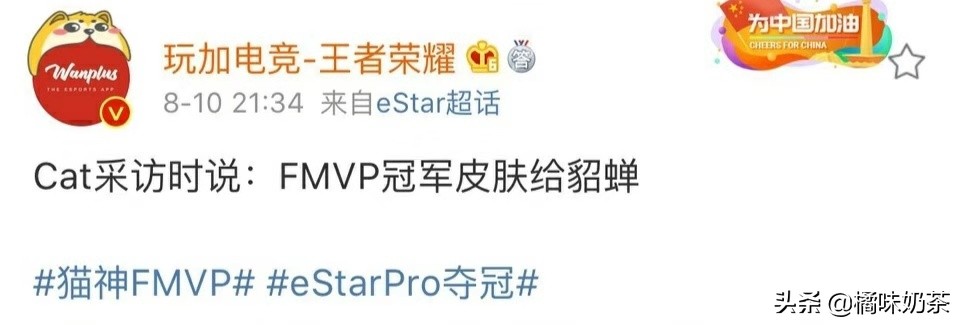 eStar猫神荣获世冠总决赛FMVP,FMVP定制皮肤给到貂蝉,出乎你的意料吗