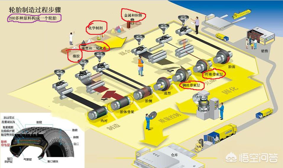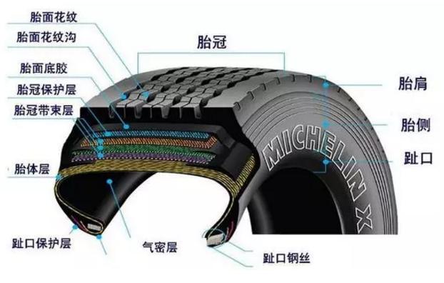 汽车轮胎的主要成分由橡胶、碳黑和二氧化硅、化学制剂等以及钢丝带束层和纤维带束层组成。