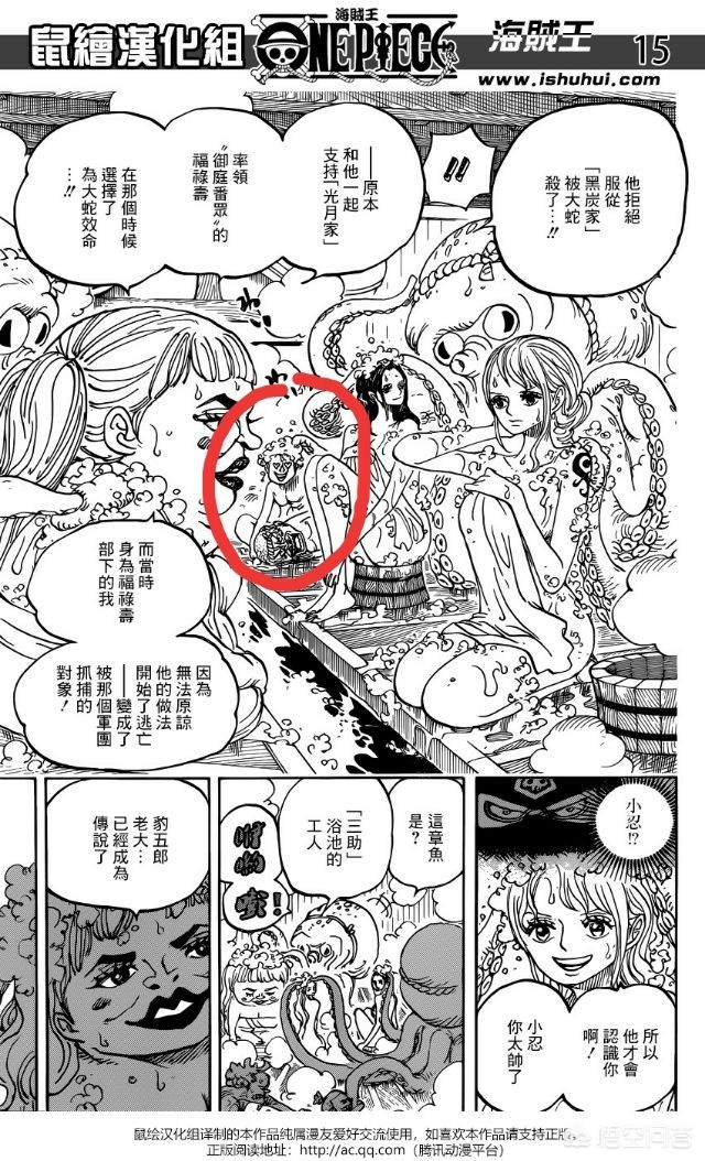 当然忍者大妈认为是自己的到来引起可男人们的瞩目。 泡暖身子后,忍者大妈带娜美她们去和章鱼play play,一番上下其触手后,她们洗干净了背和头发,感到特别满足。当然在这里也是有那些男人们的耳目,这他喵的是躲都不躲,直接趴着偷看啊。真没想到你居然是这样的尾田。对了,替海迷们问一下官方会出本子吗?我先预定一本。