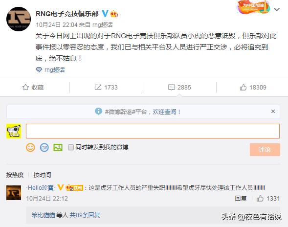 根据下面评论区的粉丝留言,夜色发现原来罪魁祸首是虎牙平台。原来,虎牙平台在直播S10的时候会在赛间休息时播放自己录制的一些节目,其中有一段节目是工作人员在街头采访路人来问一些关于电竞的问题。其中有一个问题就是:‘春之虎帝夏之捞逼是指哪位LOL选手?’这个问题相信看过英雄联盟电竞赛事网友都知道说的是RNG的小虎。看到自己战队的队员被诋毁,RNG也是采取豪不容忍的态度进行了严正的警告,在RNG官方发的微博下面,网友评论也是一片支持。