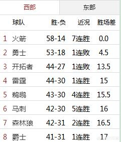 截止到北京时间2018年3月28日,雷霆(44胜31负)、鹈鹕(43胜32负)、马刺(43胜32负)、爵士(42胜32负)、森林狼(42胜33负)、掘金(40胜35负),分别排在西部第四到第九。