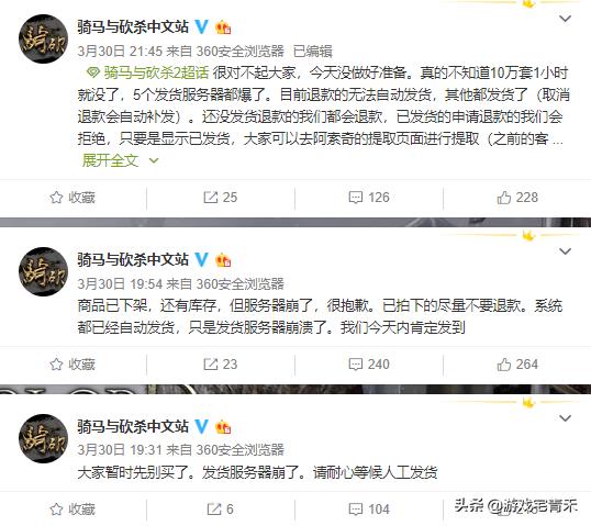 等了太久的玩家遇上了“超市大甩卖”,《骑砍2》一小时卖了将近10W套游戏!!发货服务器都给挤蹦了...骑砍中文站连发两条微博喊大家住手,依然抵挡不住玩家的热情,又过了俩小时直接发不出货了!!