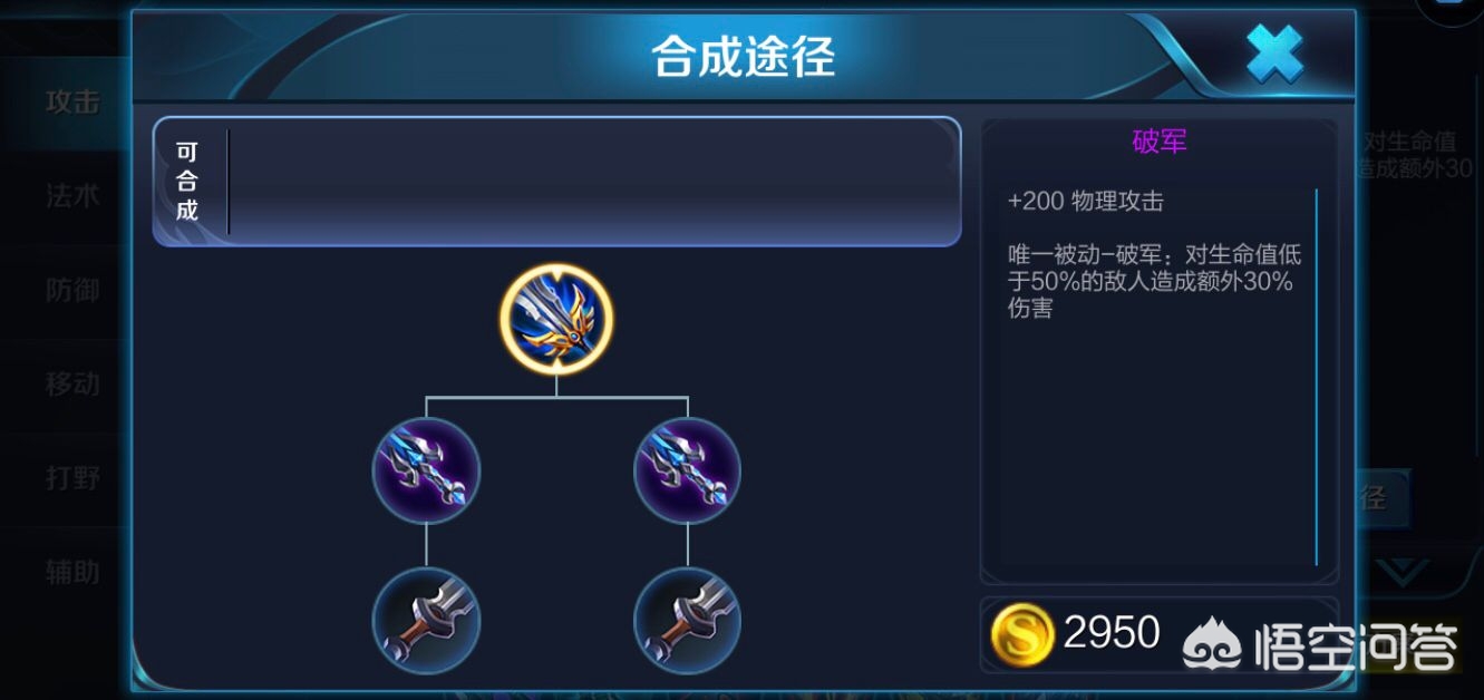 破军所需经济是2990,仅次于破晓。也是目前中物理伤害增幅最高的装备,伤害效果不言而喻,可以增加200点物理攻击,如果自身血量低于50%的时候,可以提升自己30%的输出伤害。