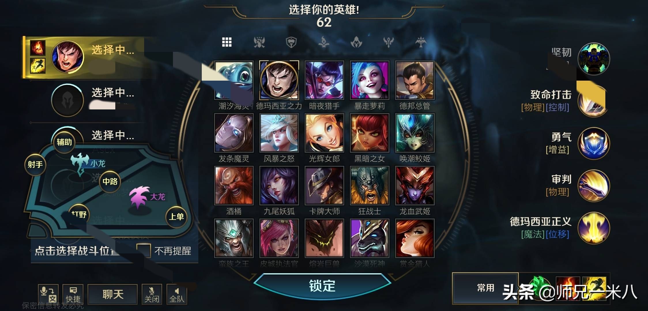 进入BP环节,可以看到左边可以选择自己想玩的位置,比如盖伦就是一位上单英雄。