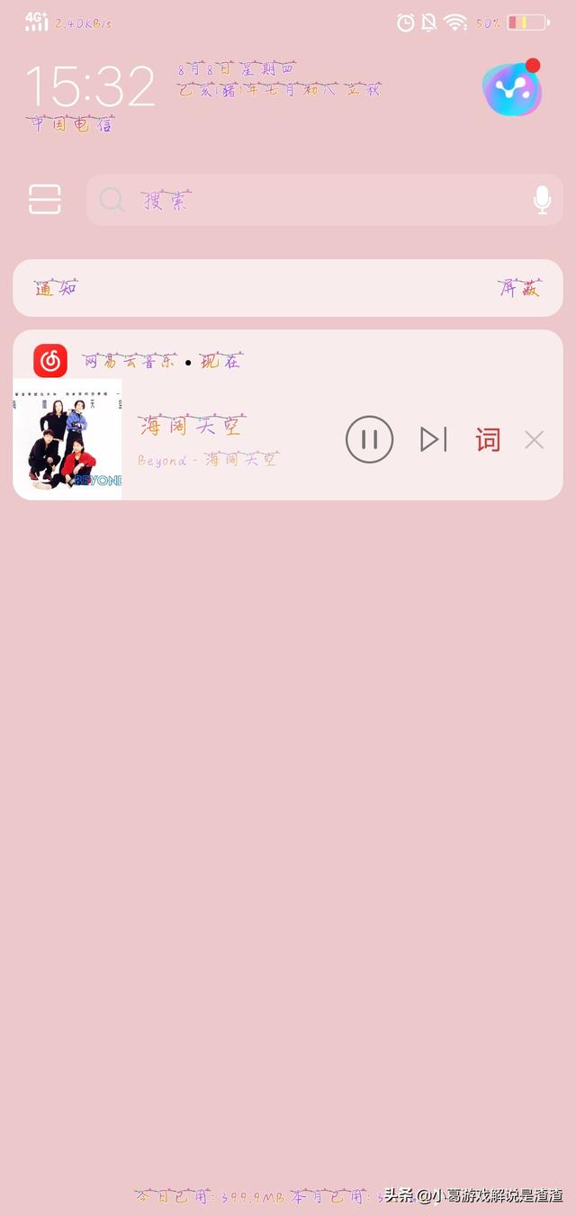 第3步呢,你把你的这个手机呀,就是从上面往下拉就会出现通知栏,就会有歌的名字,还有一个是,嗯暂停的和下一首还有一个词的这个标志,还有个叉叉这种样子的,然后我们点开这个词,然后歌词就出来了,就在后台,这一点只给那些不知道怎么显示歌词的人说,会的话就不用看这一段。